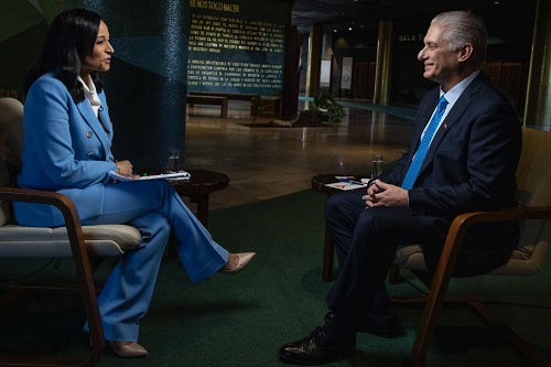 Miguel M. Díaz-Canel.- Bueno, nosotros si estamos en una conversación es porque aspiramos a que podamos llegar a un acuerdo. Y te lo decía por esta circunstancia, para llegar a un acuerdo depende de la disposición de las dos partes a encontrar esas áreas de colaboración y de cooperación; a construir esos espacios de entendimiento, a abordar esto con sensibilidad, con responsabilidad y también con mucha seriedad.